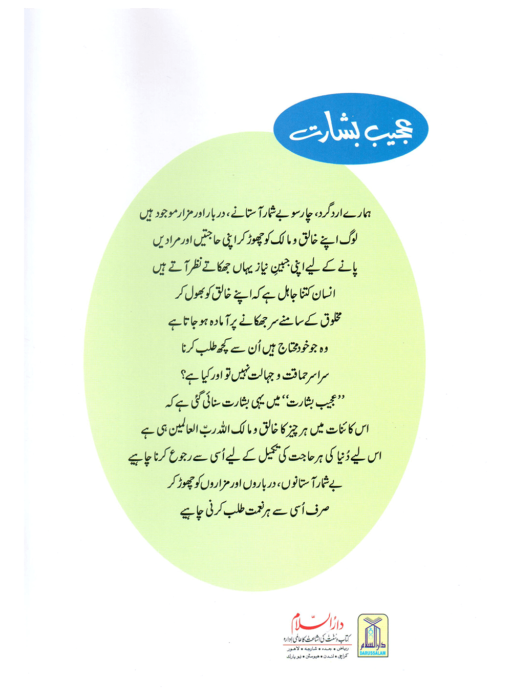 عجیب بشارت میں یہی بشارت سنائی گئی ہے کہ اس کائنات میں ہر چیز کا خالق و مالک اللہ رب العالمین ہی ہے اس لیے دنیا کی ہر حاجت کی تکمیل کے لیے اس سے رجوع کرنا چاہیے۔ بے شمار آستانوں، درباروں اور مزاروں کو چھوڑ کر صرف اسی سے ہر نمت طلب کرنی چاہیے۔