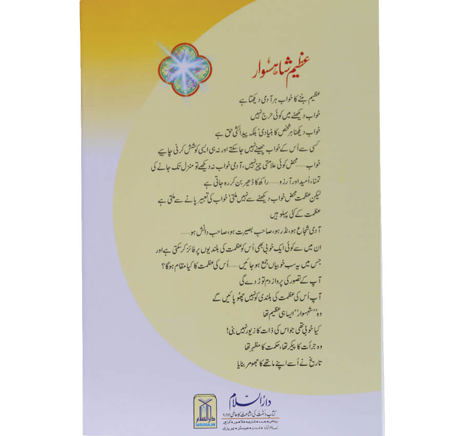 عظیم بنے کا خواب ہر آدمی دیکھتا ہے خواب دیکھنے میں کوئی حرج نہیں خواب دیکھنا ہرشخص کا بنیادی بلکہ پیدائشی حق ہے کسی سے اس کے خواب چھینے نہیں جاسکتے اور نہ ہی ایسی کوشش کر نی چا ہیے خواب محض کوئی علامتی چیزنہیں ، آ د می خواب نہ دیکھے تو منزل تک جانے کی تمنا، أمید اور آرزو. راکھ کا ڈھیر بن کر رہ جاتی ہے لیکن عظمت محض خواب دیکھنے سے نہیں ملتی خواب کی تعبیر پانے سے ملتی ہے آ دمی شجاع ہو، نڈر ہو، صاحب بصیرت ہو ، صاحب دانش ہو۔ ان میں سے کوئی ایک خوبی بھی اس کو عظمت کی بلندیوں پر فائز کرسکتی ہے اور جس میں یہ سب خوبیاں جمع ہوجائیں. اس کی عظمت کا کیا مقام ہوگا ؟ عظمت کے کئی پہلو ہیں آپ کے تصور کی پرواز وم توڑ دے گی آپ اس کی عظمت کی بلندی کونہیں پٹو پائیں گے و شہسوار ایسا ہی عظیم تھا کیا خوبی تھی جو اس کی ذات کا زیور ہیں بنی! رو جبرات کا پیر تھا، حکمت کا مظہر تھی تاریخ نے اسے اپنے ماتھے کا جھومر بنایا