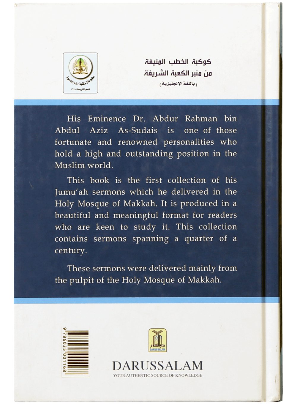 His Eminence Dr. Abdur Rahman bin Abdul Aziz As-Sudais is one of those fortunate and renowned personalities who hold a high and outstanding position in the Muslim world. This book is the first collection of his Jumu’ah sermons which he delivered in the Holy Mosque of Makkah. It is produced in a beautiful and meaningful format for readers who are keen to study it. This collection contains sermons spanning a quarter of a century and covering a multitude of topics related to the Muslims and the Muslim world.