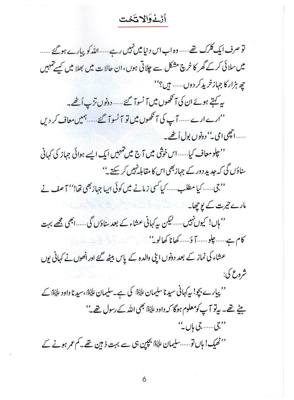 وقت کسی کے لیے نہیں رکتا، یہ مقولہ ہم سنتے رہتے ہیں، لیکن ایک بندے نے سورج کو اشارہ کیا اور سورج غروب ہونے سے رک گیا، یہ بات نئی محسوس ہوتی ہے۔ ہوا ہمیشہ کشتیوں کے مخالف سمت میں چلتی ہے یہ بھی سنتے آ ئے ہیں، لیکن ہوا کسی کے حکم کی پابند ہو، جدھر وہ چاہے اسی طرف چلنا شروع ہو جائے، اس نے سفر کرنا ہو، ہوا اس کا تخت اٹھا کے چلنا شروع کر دے، پرندوں کے پر اس کے لیے سائبان کا کام دیں، ایسا شخص کون ہوسکتا ہے اور یہ سب کیسے ممکن ہے؟ یہ جاننے کے لیے پڑھیے اڑنے والا تخت اور پھر وہ کیجیے جس کا حکم ہر چیز کے مالک نے ان کو دیا۔