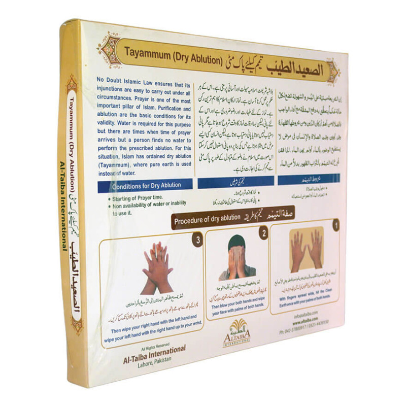 Need of All Muslims Tayammum is an Arabic word and is an Islamic act. It means to purify yourself without water. Tayammum kit is performed using clean and dry earth. It is in place of ablution (wudu) or bath (ghusl) when clean water is not available. The second condition is that the water is available but the user is suffering from a condition in which he cannot use water. Conditions for Dry Ablution: Prayer time has started. When sufficient water is not available for ritual washing (ghusal) or Dry ablution (wudu). When he cannot use water. Method of Tayammum: Keeping your fingers wide open, hit the clean earth once using palms of your both hands. Blow your both hands and wipe your face with your both hands. Wipe your right hand with your left hand and then your left hand with your right hand up to your wrist. This tayammum is the replacement both for wudu and ghusal (Pak Matti). This tayammum will become invalidated (finished) when water becomes available and you will have to perform wudu or ghusl. Features of Tayammum Boxes Prepared by Al-Taiba International: For your convenience, we have prepared “Tayammum Box” with the following features: This box is available in beautiful packing. Packing in two sizes is available for your convenience. It is very handy and easy to carry. You can pack it easily in your journey bag and it does not occupy much space. It is light-weight and will not add much to your weight. Description: Tayammum box price is performed using clean earth or anything specified by the Islamic scholars. Al-Taiba International has prepared tayammum box for your convenience.Dry Ablution for persons is unable to use water or either water is unavaible