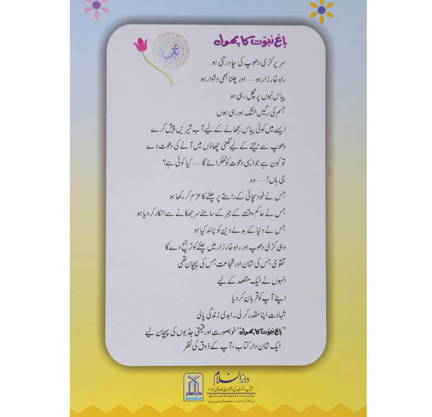سر پر کڑی دھوپ کی چادر تنی ہو راه خار زار ہو اور چلنا بھی دشوار ہوپیاس لہوں پر مچل رہی ہو جسم کی رگیں خشک ہورہی ہوں - ایسے میں کوئی پیاس بجھانے کے لیے آب شیر یں پیش کرے دھوپ سے بچنے کے لیے گھنی چھاؤں میں آنے کی دعوت دے تو کون ہے جواایسی دعوت کو ٹھکراۓ گا. کیا کوئی ہے؟ جس نے خود سچائی کے راستے پر چلنے کا عزم کر رکھا ہو جس نے حاکم وقت کے جہر کے سامنے سر جھکانے سے انکار کر دیا ہو جس نے دنیا کے بدلے دین کو پند گیا ہو وہی کڑی دھوپ اور راہ خار زار میں چلنے کو ترجیج دے گا تقوی جس کی شان اور شجاعت جس کی پہچان تھی انہوں نے ایک مقصد کے لیے اپنے آپ کو قربان کر دیا شہادت اپنا مقدر کر لی۔ ابدی زندگی پانی ان خوبصورت اور جیتی جذبوں کی پہچان لے ایک شان دار کتاب ،آ پ کے ذوق کی نظر