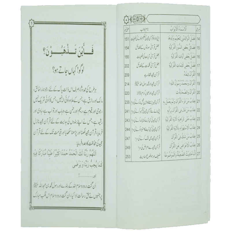 اس کتاب میں قرآن مجید کے فضائل، قرآن مجید پڑھنے اور پڑھانے کے فضائل، قرآن مجید زبانی زیاد کرنے کے فضائل، قرآنی سورتوں کے فضائل، قرآنی آیات کے فضائل، تلاوت قرآن کے آداب، قرآن مجید سے اعراض کی سزا، قرآنی احکام کو ناپسند کرنے اور استہزا کرنے کی سزا کے علاوہ بعض قرآنی سورتوں کے بارے میں ضعیف اور موضوع روایات کا ذکر کیا گیا ہے۔