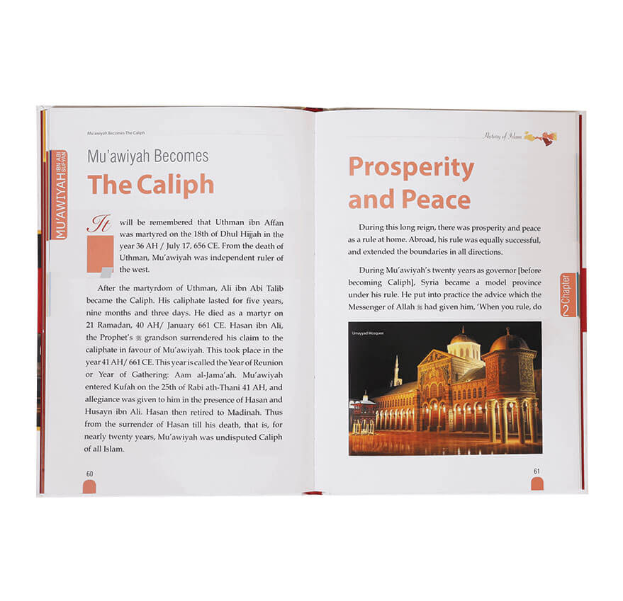 History of Islam, the Caliphate of Banu Umayyah, Mu’awiyah ibn Abi Sufyan (RA) is the fifth book in the History of Islam series by Darussalam. This series is developed to allow the Muslim youth to study authentic Islamic history and the glorious days of their past. This book deals with the life and rule of Amir Mu’awiyah (RA), a critical figure in the history of Islam. Mu’awiyah (RA) was successful in ending the destructive civil war era of Islam and his caliphate laid the foundation of the Umayyad Dynasty which operated for ninety years until it was overthrown by the Abbasids. The book is divided into four chapters namely, The Umayyads, Political Skills of Mu’awiyah, The conquests Resumed, and Mu’awiyah and Reforms.
