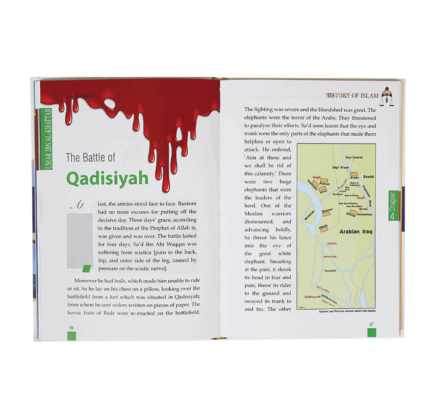 History of Islam, Age of the Rightly Guided Caliphs, Umar ibn al-Khattab (RA) is the second book in the History of Islam series by Darussalam. This series is developed to facilitate the Muslim youth with authentic information about the history of Islam and its glorious days. Featuring attractive illustrations, clear maps and real-time pictures of historic places related to the caliphate of Umar ibn al-Khattab (RA), this compilation by Maulvi Abdul Aziz is a quality book for Muslims of all ages. The second volume of the History of Islam series is divided into seven chapters due to the rich details related to the second caliph of Islam. The first chapter deals with the early life of Umar ibn al-Khattab (RA), the second reveals the battles he took part in, the third informs the readers about Umar’s preparations to fight the Persians, the fourth highlights the important events in the battle of Qadisiyah, the fifth details the conquest of Jerusalem, the sixth speaks about the personality of Umar ibn al-Khattab (RA) and the final chapter explains the new method of selecting a caliph.