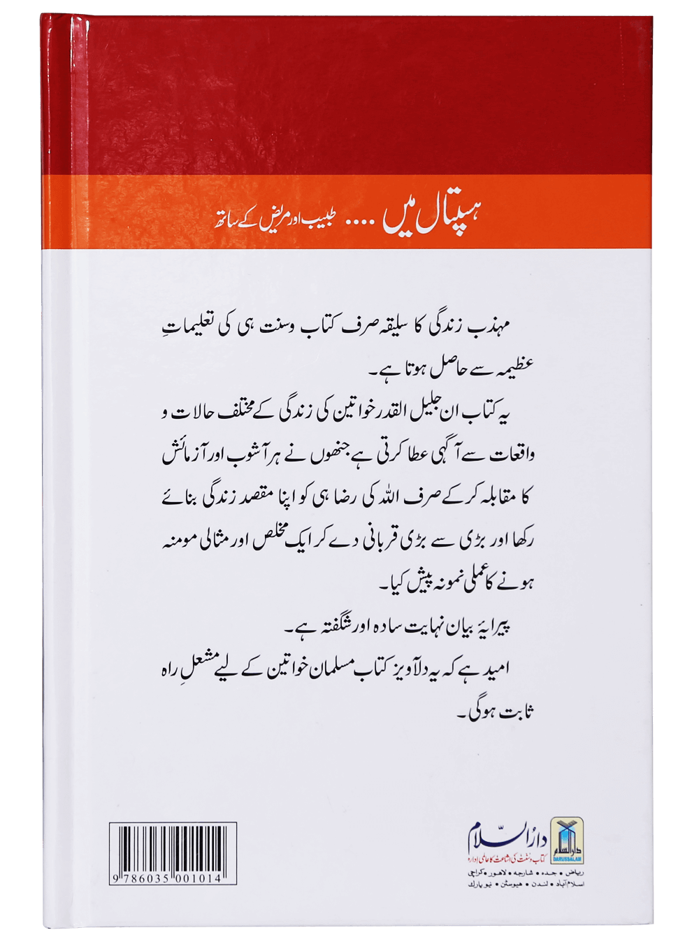 بیماری سے مومن کے گناہ معاف ہوتے ہیں اور مریض کی عاجزی اور تسبیح و تہلیل قبول فرما کر اللہ تعالیٰ اسے جنت عطا کرنے کا فیصلہ کر دیتا ہے۔ زیر نظر کتاب`ہسپتال میں طبیب اور مریض کے ساتھ` دکتور محمد عبد الرحمٰن العریفی کی عربی تصنیف ہے جس کو مولانا حافظ قمر حسن کے نہایت خوش اسلوبی کے ساتھ اردو ترجمہ میں ڈھالا ہے۔موصوف نے کتاب ہذا میں مریض، طبیب اور علاج معالجہ سے متعلق دینی احکامات کو قلمبند کیا ہے اور مریض کے عیادت کے فضائل کے ساتھ ساتھ عیادت کے آداب وغیرہ کو بھی درج کیا گیا ہے۔ اللہ تعالیٰ مصنف و مترجم کے لیے بلندی درجات کو سبب بنائے اور اہل اسلام کو ان سے زیادہ سے زیادہ استفادہ کرنے کی توفیق عطا فرمائے
