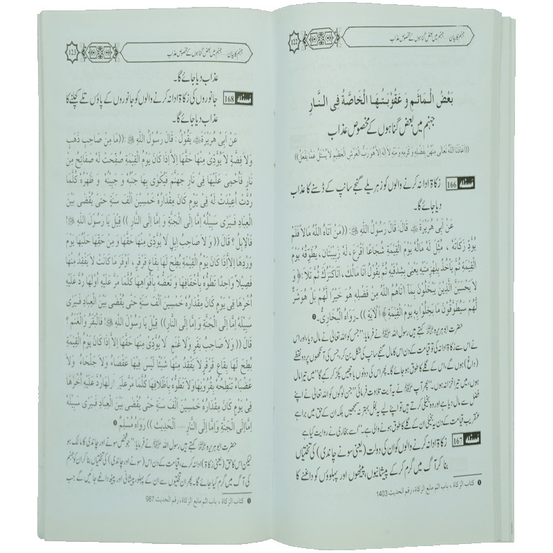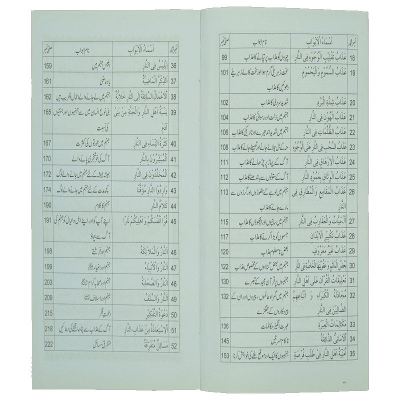 اس کتاب میں جہنم کے وجود کا ثبوت، جہنم کے دروازے اور درجات، ہلکا ترین عذاب، آگ کی شدت، اہل جہنم کا کھانا پینا، لباس، بستر، چھتریاں، قناتیں، ہتھکڑیاں اور بیڑیاں، نیز جہنم میں لوہے کے ہتھوڑوں، گرزوں، سانپوں اور بچھوؤں، زہریلی گیس اور زہریلے دھوئیں کے عذابوں کا ذکر قرآن مجید اور احادیث صحیحہ کے حوالے سے کیا گیا ہے۔