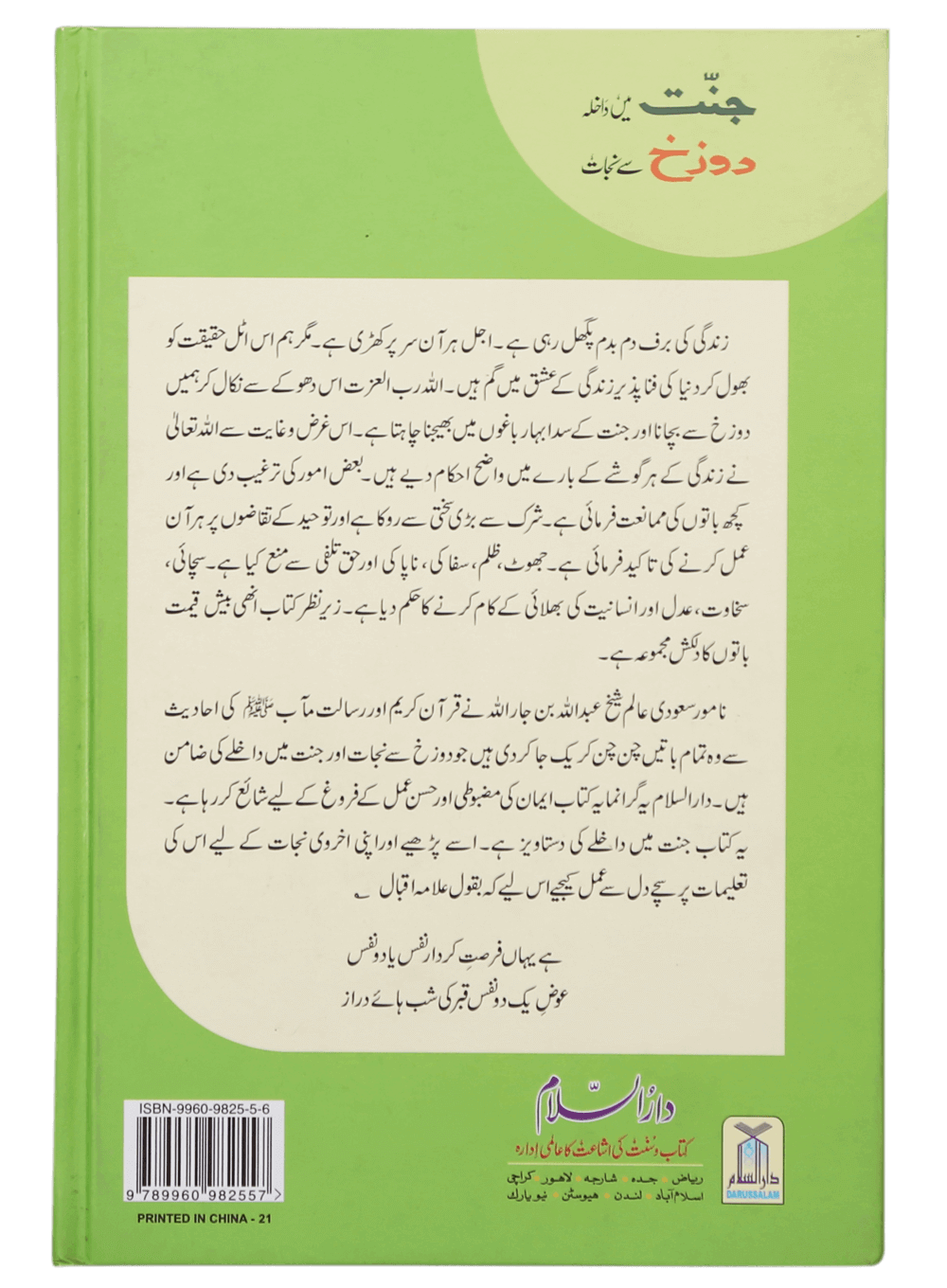 زندگی کی برف دم بدم پگھل رہی ہے۔ اجل ہر آن سر پر کھڑی ہے۔ مگر ہم اس اٹل حقیقت کو بھول کر دنیا کی فنا پذیر زندگی کے عشق میں گم ہیں۔ اللہ رب العزت اس دھوکے سے نکال کر ہمیں دوزخ سے بچانا اور جنت کے سدا بہار باغوں میں بھیجنا چاہتا ہے۔ اس غرض و غایت سے اللہ تعالیٰ نے زندگی کے ہر گوشے کے بارے میں واضح احکام دیے ہیں۔ بعض امور کی ترغیب دی ہے اور کچھ باتوں کی ممانعت فرمائی ہے۔ شرک سےبڑی سختی سے روکا ہے اور توحید کے تقاضوں پر ہر آن عمل کرنے کی تاکید فرمائی ہے۔ جھوٹ، ظلم، سفاکی ، ناپاکی اور حق تلفی سے منع کیا ہے ۔ اور سخاوت، عدل اور انسانیت کی بھلائی کے کام کرنے کا حکم دیا ہے۔ زیرِ نظر کتاب انھی بیش قیمت باتوں کا دلکش مجموعہ ہے۔ نامور سعدی عالم شیخ عبداللہ بن جاراللہ نے قران کریم اور رسالت مآب ﷺ کی احادیث سے وہ تمام باتیں چن چن کر یک جا کردی ہیں جو دوزخ سے نجات اور جنت میں داخلے کی ضامن ہیں۔ دارالسلام یہ گرانمایہ کتاب ایمان کی مضبوطی اور حسن عمل کے فروغ کے لیے شائع کر رہا ہے۔ یہ کتاب جنت میں داخلے کی دستاویز ہے۔ اسے پڑھیے اور اپنی اخروی نجات کے لیے اس کی تعلیمات پر سچے دل سے عمل کیجیے ۔