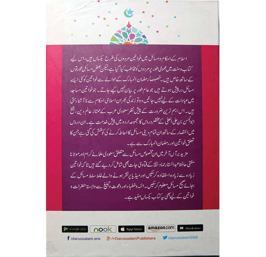 اسلام کے احکام و مسائل میں خواتین مردوں کی طرح یکساں ہیں، اس لیے کتاب و سنت میں عمومی طور پر مردوں کو مخاطب کیا گیا ہے، لیکن بعض مسائل عورتوں کے ساتھ خاص ہیں۔ خصوصاََ رمضان المبارک کے حوالے سے خواتین کو کئی ایسے مسائل درپیش ہوتے ہیں جو عام طور پر بیان نہیں کیے جاتے۔ جو خواتین مساجد میں عبادت کے لیے نہیں جاتیں وہ تو زندگی بھر ان اسلامی احکام سے نا آشنا رہتی ہیں۔ اس اہم ترین ضرورت کے پیش نضر سعودی عرب کے ممتاز علم دین، شیخ ابوالحسن بن علی العلی کے مختصر دروس کا مجموعہ اردو زبان میں پیش خدمت ہے۔ ان دروس میں اختصار کے ساتھ ان تمام دینی مسائل کا احاطہ کرنے لی کوشش کی گئی ہے جن کا تعلق خواتین اور رمضان المبارک سے ہے۔ مزید برآں آخر میں ان مخصوص مسائل سے متعلق سعودی علمائے کرام اور مولانا مفتی عبدالستار حماد حفظہ اللہ کے فتاویٰ جات بھی شامل کر دیے گیے ہیں تاکہ خواتین زیادہ سے زیادہ استفادہ کرسکیں اور میڈیا پرنشر ہونے والے غلط سلط مسائل کی بجائے صحیح مسائل معلوم کر سکیں۔ ائمہ و خطباء اور دعوت و تبلیغ سے وابستہ حضرات و خواتین کے لیے بھی یہ کتاب یکساں مفید ہے۔