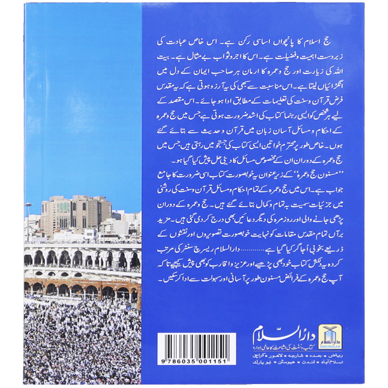 حج بیت اللہ ارکانِ اسلام میں ایک اہم رکن ہے بیت اللہ کی زیارت او رفریضۂ حج کی ادائیگی ہر صاحب ایمان کی تمنا اور آرزو ہے ہر صاحب استطاعت اہل ایمان کے لیے زندگی ایک دفعہ فریضہ حج کی ادائیگی فرض ہے اور اس کے انکار ی کا ایمان کامل نہیں ہے اور وہ دائرہ اسلام سےخارج ہے اجر وثواب کے لحاظ سے یہ رکن بہت زیادہ اہمیت کاحامل ہے تمام كتب حديث وفقہ میں اس کی فضیلت اور احکام ومسائل کے متعلق ابو اب قائم کیے گئے ہیں اور تفصیلی مباحث موجود ہیں ۔حدیث نبویﷺ کہ آپ نےفرمایا الحج المبرور لیس له جزاء إلا الجنة ``حج مبرور کا ثواب جنت سوا کچھ اور نہیں ۔اس موضوع پر اب تک اردو و عربی زبان میں چھوٹی بڑی بیسیوں کتب لکھی جاچکی ہیں زیرنظر کتاب کتب دینیہ کی اشاعت کے عالمی ادار ے دار السلام کی اس سلسلے میں ایک اہم کا وش ہے جس میں حج وعمرہ کے تمام مسائل او ر اس دوران پڑھی جانے والی دعائیں قرآن وحدیث کی روشنی میں جمع کر دی گئی ہیں مزید برآں تمام مقدس مقامات کو نہایت خوبصورت تصویروں او ر نقشوں کے ذریعے بخوبی اجاگر کیا گیا ہے دار السلام کی مرتب کردہ یہ دلکش کتاب خود پڑھنے اور عزیز واقارب دوست احباب کو تحفہ دینے کے لائق ہے تاکہ حج وعمرہ کے فرائض مسنون طریقے سے ادا کیے جاسکیں اللہ تعالی دار السلام کی اس کاوش کو اہل اسلام کے لیے مفید بنائے۔