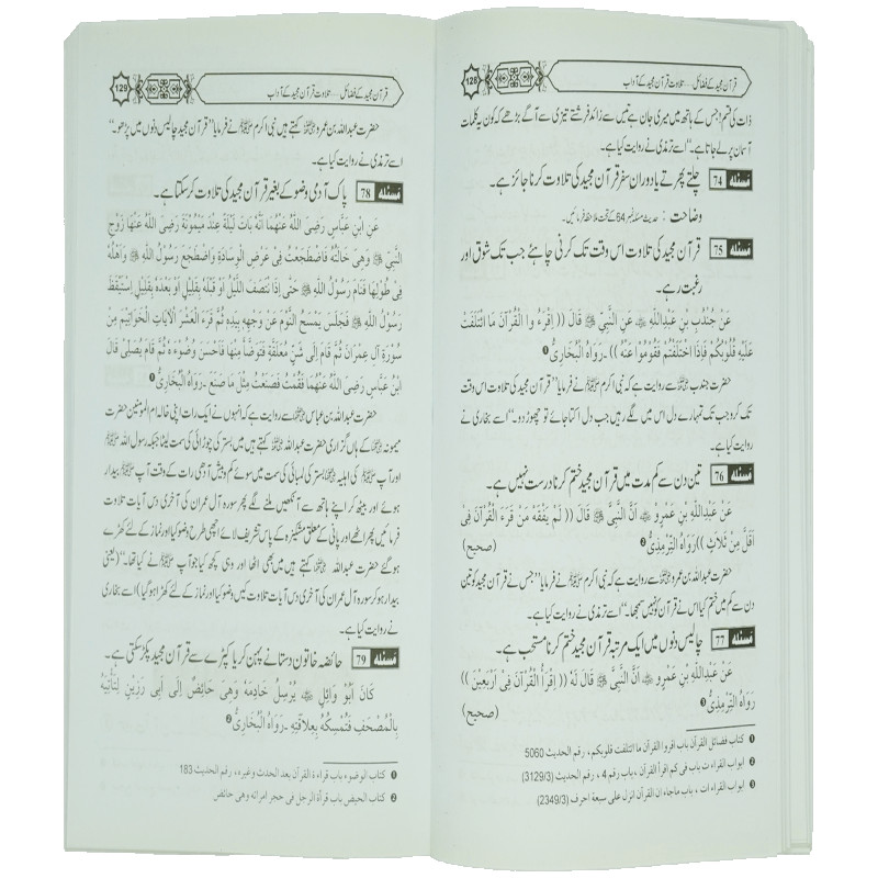 اس کتاب میں قرآن مجید کے فضائل، قرآن مجید پڑھنے اور پڑھانے کے فضائل، قرآن مجید زبانی زیاد کرنے کے فضائل، قرآنی سورتوں کے فضائل، قرآنی آیات کے فضائل، تلاوت قرآن کے آداب، قرآن مجید سے اعراض کی سزا، قرآنی احکام کو ناپسند کرنے اور استہزا کرنے کی سزا کے علاوہ بعض قرآنی سورتوں کے بارے میں ضعیف اور موضوع روایات کا ذکر کیا گیا ہے۔