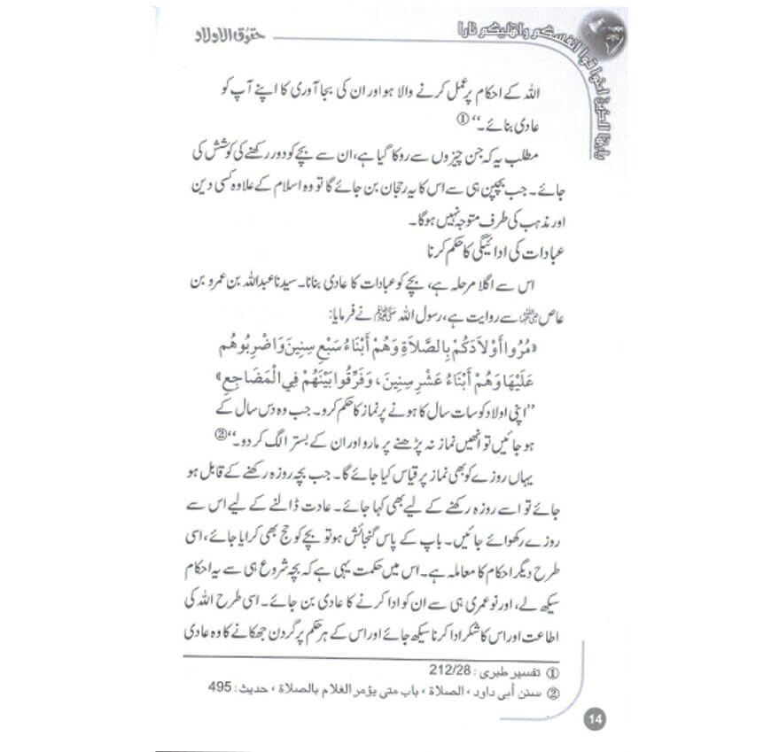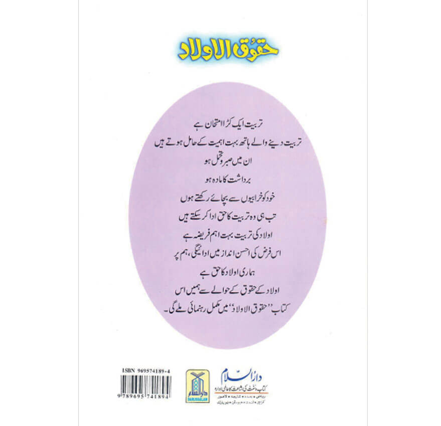 A concise part of the comprehensive Haqooq series by the celebrated writer Hafiz Salahuddin Yousuf, Haqooq Awlad is an interesting book on the rights children have over their parents. Just like parents have rights over their children; the children also have rights over their parents in Islam. This book outlines all these right as highlighted in the various ayat of the Holy Quran and the teachings of our beloved Prophet Muhammad PBUH. It highlights the duties parents have to carry out for their children and how to properly perform them. The book touches core areas such as education, provision of basic necessities, good manners, good conduct and necessary supervision. It also sheds light on the four bad habits most children are likely to adopt in the world today and how parents can prevent them. All solutions and guidance mentioned in this book are derived from the teachings of Quran and Sunnah and this book gives detailed references on all of its claims. The book comprises 66 pages in total and is written in Urdu language.