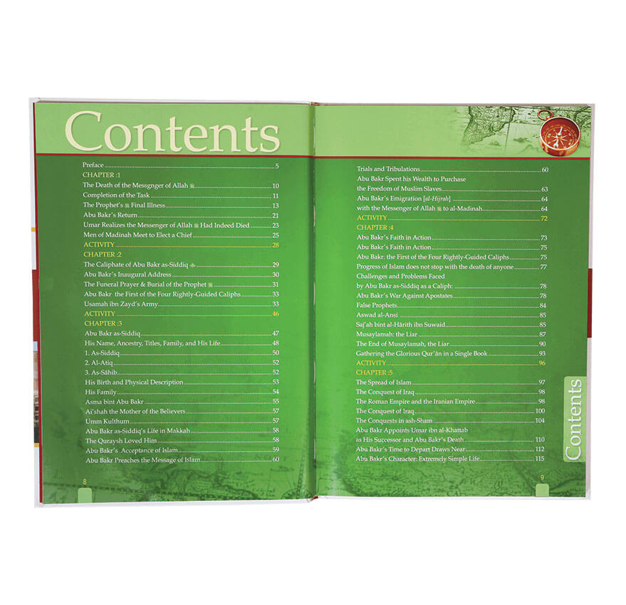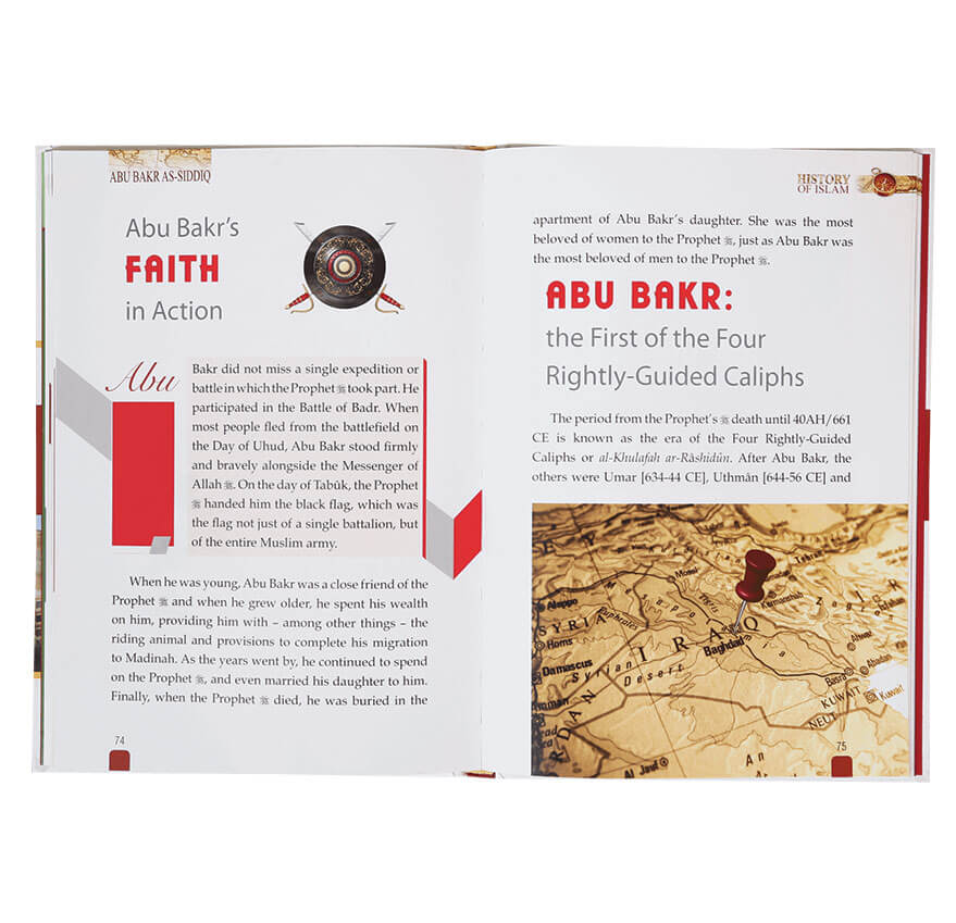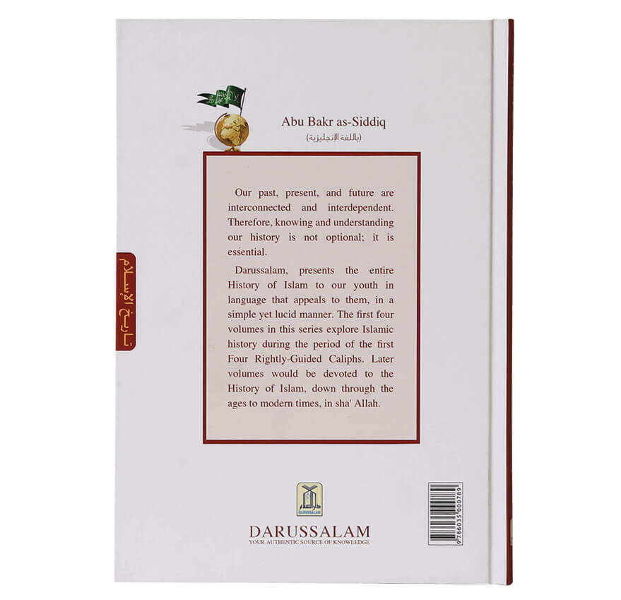 History of Islam, Age of the Rightly Guided Caliphs, Abu Bakr as-Siddiq (RA) is the first volume in the History of Islam series by Darussalam. This unique series of books is developed to provide Muslim youth with authentic information about the history of Islam and its glorious days. Written by Maulvi Abdul Aziz, the book has been divided into five chapters and features colorful illustrations, maps and real-time pictures of historic places and events that happened during the life of Abu Bakr as-Saddiq. The first chapter deals with the events that happened after the death of Prophet Muhammad PBUH, the second deals with the caliphate of Abu Baks As-Siddiq, the third informs the readers about the ancestry, titles, family and life of Abu Baks As-Siddiq and the final chapter highlights the spread of Islam and conquest of Iraq under the leadership of the first caliph of Islam.