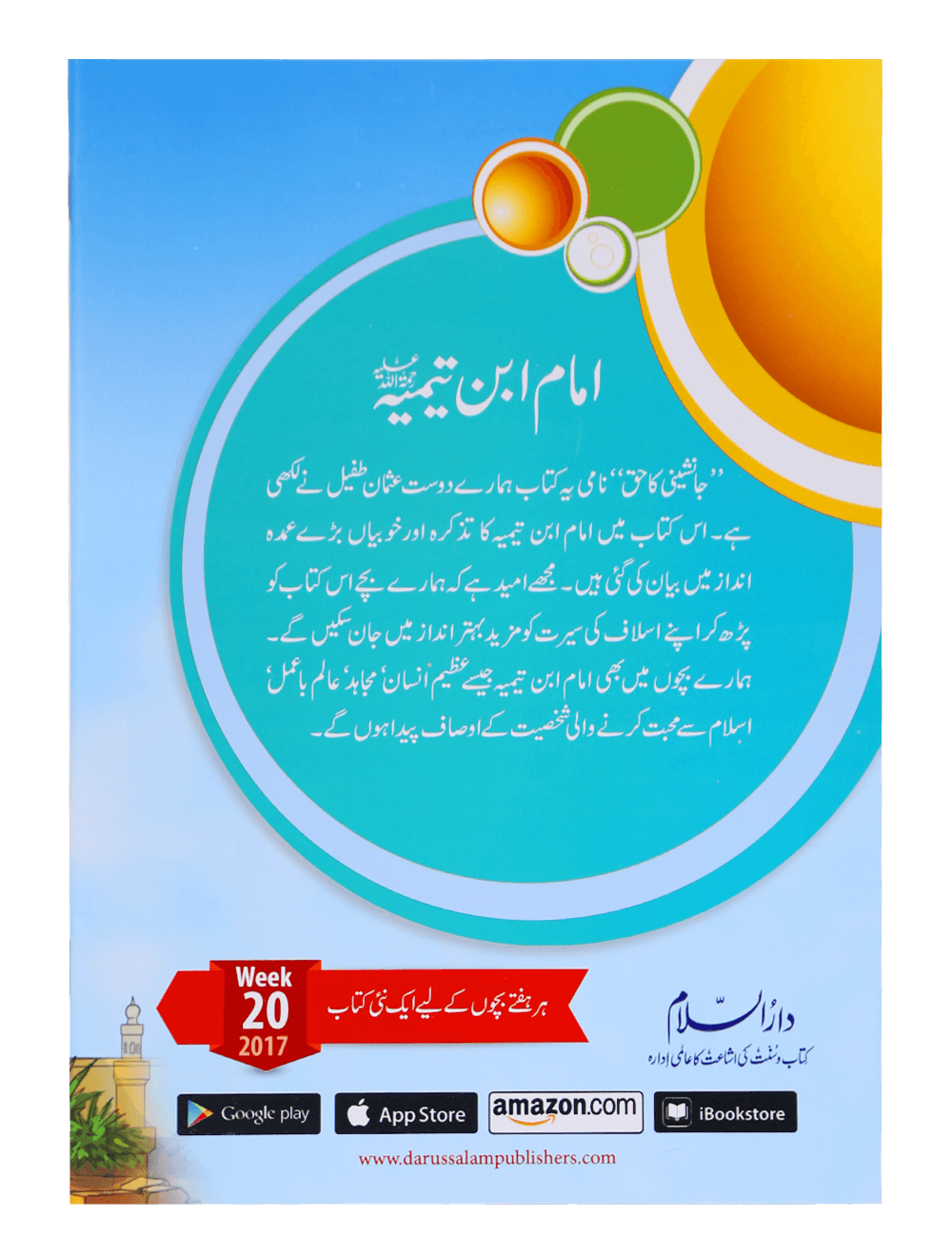 جاشینی کا حق‘ نامی یہ کتاب ہمارے دوست عثمان طفیل نے لکھی ہے۔ اس کتاب میں امام ابن تیمیہ کا تذکرہ اور خو بیاں بڑے عمدہ انداز میں بیان کی گئی ہیں۔ مجھے امید ہے کہ ہمارے بچے اس کتاب کو پڑھ کر اپنے اسلاف کی سیرت کو مزید بہتر انداز میں جان سکیں گے۔ ہمارے بچوں میں بھی امام ابن تیمیہ جیسے عظیم انسان مجاہد عالم باعمل اسلام سے محبت کر نے والی شخصیت کے اوصاف پیدا ہوں گے۔