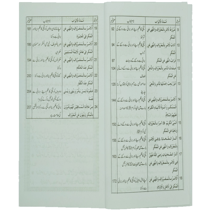 اس کتاب میں امر بالمعروف اور نہی عن المنکر کا وجوب، اس کی فضیلت، اس کی شرائط، اس کے آداب اور اس کے درجات بیان کیے گئے ہیں، نیز آمر و ناہی کی صفات بیان کی گئی ہیں۔ امر بالمعروف اور نہی عن المنکر ترک کرنے کے نقصانات واضح کیے گئے ہیں۔