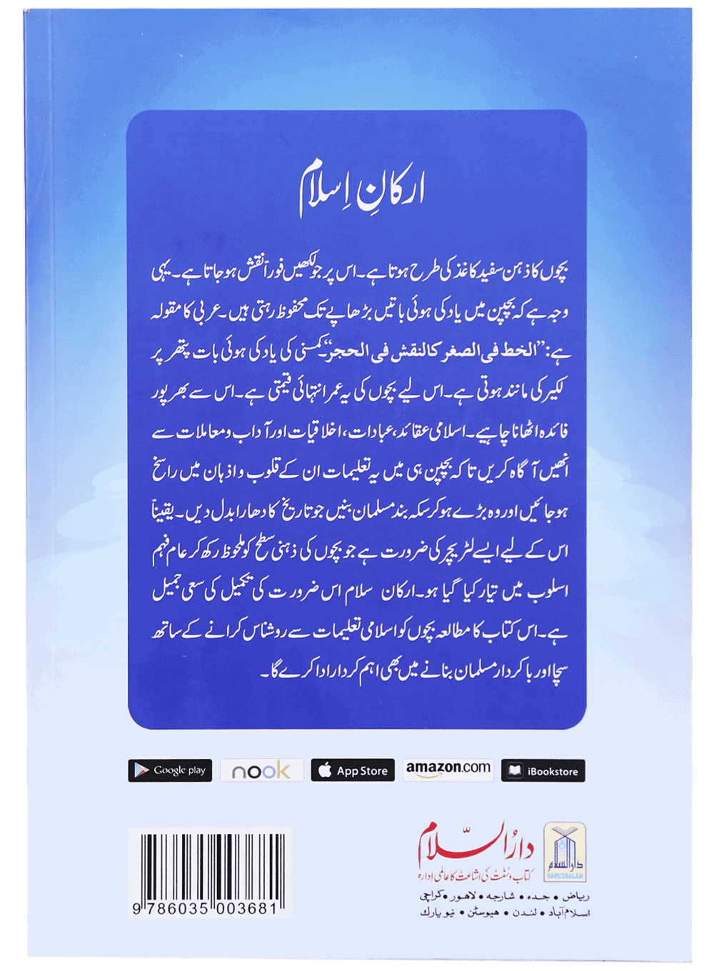 بچوں کا ذہن سفید کاغذ کی طرح ہوتا ہے۔ اس پر جو لکھیں فوراً نقش ہوجاتا ہے۔ یہی وجہ ہے کہ بچپن میں یاد کی ہوئی باتیں بڑھاپے تک محفوظ رہتی ہیں۔ عربی کا مقولہ ہے کہ کمسنی کی یاد کی ہوئی بات پتھر پر لکیر کی مانند ہوتی ہے۔ اس لیے بچوں کی یہ عمر انتہائی قیمتی ہے۔ اس سے بھرپور فائدہ اُٹھانا چاہیے۔ اسلامی عقائد، عبادات، اخلاقیات اور آداب و معاملات سے انھیں آگاہ کریں تا کہ بچپن ہی میں یہ تعلیمات ان کے قلوب و اذہان میں راسخ ہو جائیں اور وہ بڑے ہو کر سکہ بند مسلمان بنیں جو تاریخ کا دھارا بدل دیں۔ یقیناً اس کے لیے ایسے لٹریچر کی ضرورت ہے جو بچوں کی ذہنی سطح کو ملحوظ رکھ کر عام فہم اسلوب میں تیار کیا گیا ہو۔ ارکان اسلام اس ضرورت کی تکمیل کی سعی جمیل ہے۔ اس کتاب کا مطالعہ بچوں کو اسلامی تعلیمات سے روشناس کرانے کے ساتھ سچا اور باکردار مسلمان بنانے میں بھی اہم کردار ادا کرے گا۔