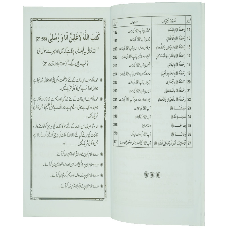 اس کتاب میں رسول اکرم کے فضائل کے علاوہ آپ کی بنی انسان پر رحمت، کافروں پر آپ کی رحمت، اہل ایمان پر آپ کی رحمت، اپنے اہل و عیال پر آپ کی رحمت، عورتوںپر، بچوں پر، مریضوں پر، فقراء اور مساکین پر، یتیموں پر، غلاموں پر قیدیوں پر اور حیوانات پر آپ کی رحمت کا تذکرہ ہے، نیز رسول اکرم کے معجزات اور واقعہ معراج بھی احادیث صحیحہ کی روشنی میں بیان کیے گئے ہیں۔