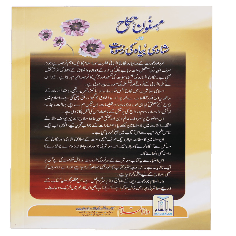 اسلامی معاشرت میں نکاح جس قدر سادہ تقریب تھی، امتدادِ زمانہ کے ساتھ یہ اسی قدر تکلفات سے بھرپور اور بد اخلاقی کا گہوارہ بنتی چلی جا رہی ہے۔ اسلام میں نکاح کے متعلق کیا ہی عمدہ احکامات اور تعلیمات ہیں لیکن ہم نے اپنی جہالت، جذبہ نمائش دولت اور رسوم و رواج کی پرستش کے باعث اس کی شکل بگاڑ دی ہے۔ اس موضوع پر معروف عالم دین اور محقق شہیر حافظ صلاح الدینیوسف نے مختلف اوقات میں جو مضامین لکھے یا استفسارات کے جواب تحریر کیے، انھیں اب ایک خاص علمی ترتیب سے اس کتاب میں جمع کر دیا گیا ہے۔ ان مضامین کا مطالعہ جہاں ایک طرف ہمیں سنت کے مطابق شادی اور نکاح کے مسائل سے آگاہ کرے گا وہاں ہمیں اس معاشرتی اور جاہلانہ رسوم سے چھٹکارے کا راستہ بھی دکھائے گا۔ اس اعتبار سے یہ کتاب معاشرے کے ہر فرد کی ضرورت اور اہل حکومت کی بے حسی پر ایک تازیانہ ہے۔ کتاب کے آخر میں گھریلو ماحول اور ازدواجی زندگی پرمسرت اور خوش گوار بنانے کے لیے چند اصول اور نصیحتیں کی گئی ہیں اس کے علاوہ شادی سے متعلق چند ضروری اور مسنون دعائیں بھی کتاب کا حصہ ہیں