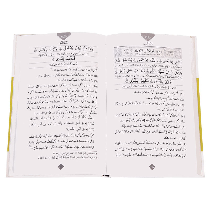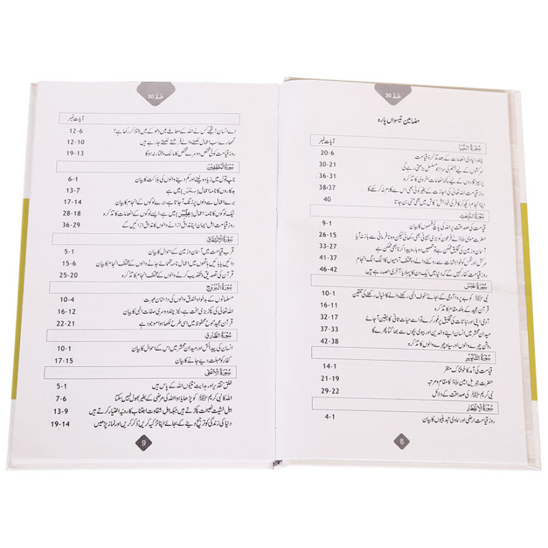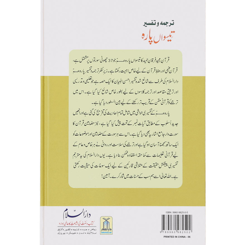 قرآن حکیم سرچشمہ رشدوہدایت اور منبع خیر وبرکت ہے،یوں تو دینی راہنمائی ،دین اسلام کی حقانیت ،توحیدکے بیان اور کفر و شرک کے ابطال کےلیے پورا قرآن ہی مجسم ہدایت ہے،لیکن عقائد کی اصلاح، جنت کی ترغیب ،روز قیامت کی ہولناکیوں اور جہنم سے ترہیب تیسویں پارے میں زیادہ بیان ہوئی ہے ۔نیزاس پارہ میں تزکیہ نفس اور اصلاح نفس پر زیادہ زور دیا گیاہے ۔اختصاروجامعیت کے اعتبار سے بھی یہ پارہ خاص اہمیت کا حامل ہے ،اس اہمیت کے پیش نظر ادارہ دار السلام نے اس پارہ کو الگ جلد میں شائع کیاہے تاکہ عوام الناس میں قرآن پڑھنے کاذوق اجاگر ہو اور وہ قرآنی تعلیمات سے کما حقہ بہرہ مند ہوسکیں