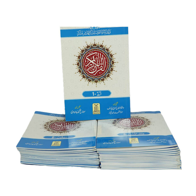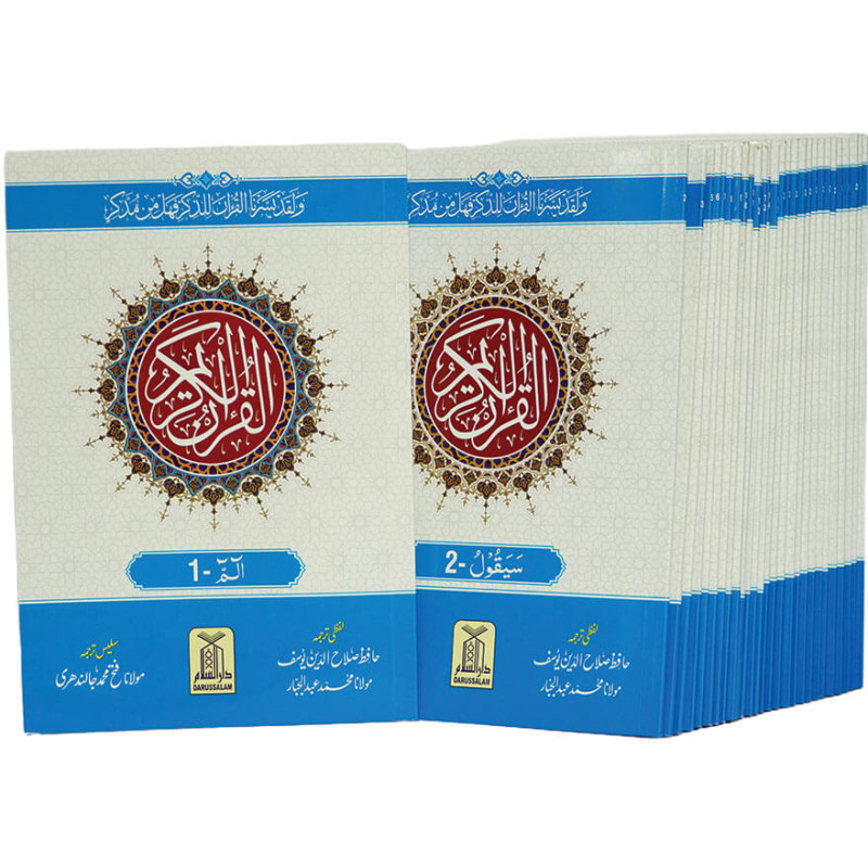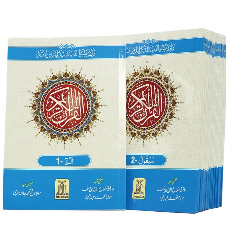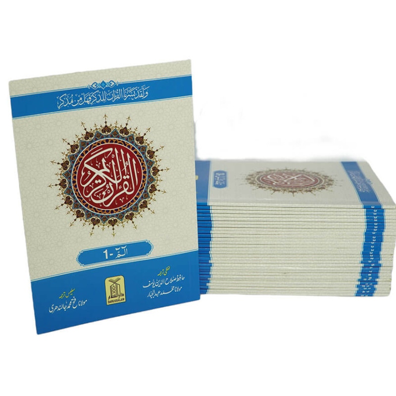 قرآن کریم ہی وہ واحد کتاب ہے جو تاقیامت انسانیت کے لیے رشد وہدایت کا سرچشمہ اور نوعِ انسانی کےلیے ایک کامل او رجامع ضابطۂ حیات ہے اسی پر عمل پیرا ہو کر دنیا میں سربلند ی او ر آخرت میں نجات کا حصول ممکن ہے لہذا ضروری ہے کہ اس کے معانی ومفاہیم کوسمجھا جائے ،اس کی تفہیم کے لیے درس وتدریس کا اہتمام کیا جائےدار السلام نے مزید آسانی کرتے ہوئے قرآن مجید کا الگ الگ پارہ ،معانی القرآن، قرآن کا لفظی ( حافظ صلاح الدین یوسف حفظہ اللہ )اور مولانا محمد فتح محمد جالندھری حفظہ اللہ کے ترجمہ کا حسین امتزاج، علمی و تحقیقی اعتبار سے مستند،دلنشیں اسلوب بیاں، خوبصورت پیشکش( پرنٹنگ)، عمدہ ورق اور مناسب قیمت پر دستیاب ہے